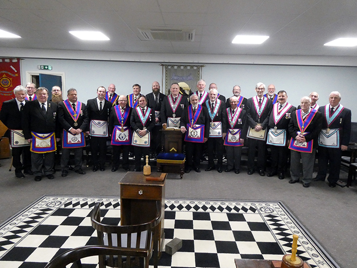| WBro. Scott was delighted to accept and proceeded to advance Bro. Simon Rhodes into Mark Masonry with sincerity and with the assistance of the Officers of the Lodge, with WBro. Roy Rhodes (candidates’ father) acting as SD and Bro. Luke Bodenham who had joined the Lodge in January acting as JD. | |