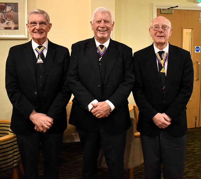 | Principal guest on the evening, representing PGM Keith Beardmore, was Steve Walls. He was accompanied by his son Chris Walls the provincial grand senior warden and Gordon Sandford provincial grand steward. Another acting officer Les Newlands provincial grand senior deacon is the lodge director of ceremonies. | |