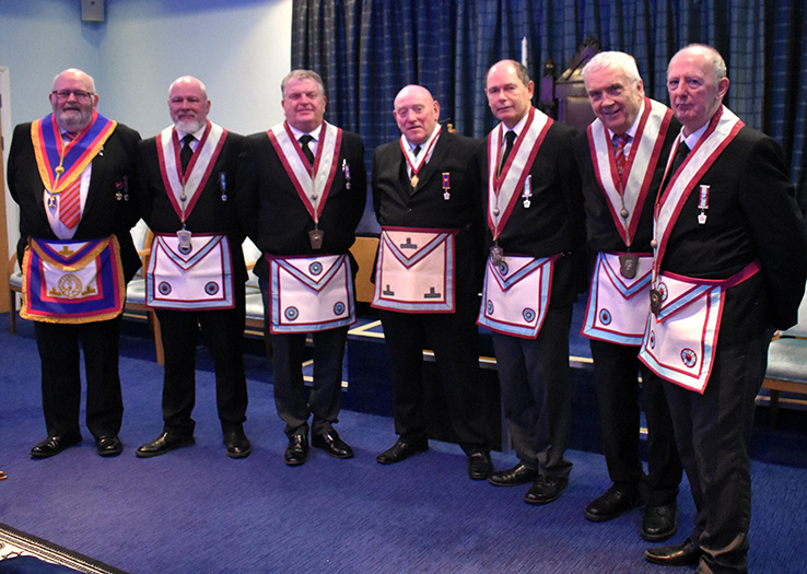 | This new strength was reflected in the appointment of the officers. Those present who were appointed to their first office in the lodge following their advancement this year were; Mike Frankland as senior overseer, Robert Bradshaw as junior overseer, Bill Renwick as senior deacon, Steve Parker as junior deacon and Peter Robinson as organist. They will have to hit the ground running but with other “junior” Brethren filling the progressive offices the lodge can look forward to the future with confidence. | |