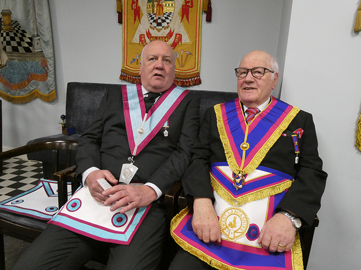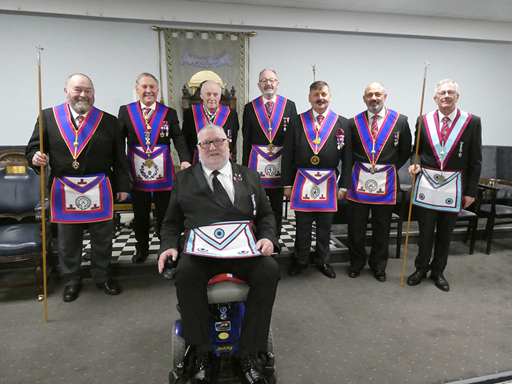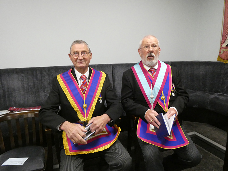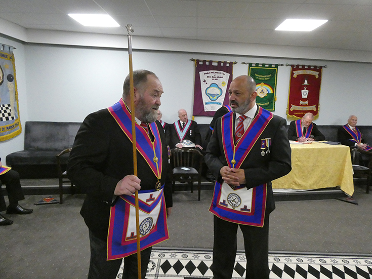 | A number of Officers were missing on the night and substitutes were called upon at the last minute to help out: WBro. Alan Barnes recently appointed Prov Steward SW, WBro. Paul Smedley the recently appointed Prov JW as JW and WBro. Andy Stansfield as MO. WBro. Peter Maxwell acted as SD for the night. All happy to help out as usual. | |