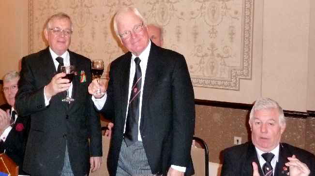 Above: The new WM, W.Bro. Terry Hudson taking wine with Peter Connolly, PGM. In the foreground is the Immediate Past and Installing Master, V.W.Bro. Danny Jones. |