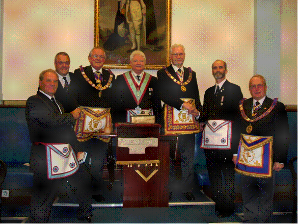 Paul's advancement marked by a distinguished rare pair Paul Ashbolt of Starkie Lodge number 1070 was recently advanced into Friendship Mark Lodge number 1549, here in Southport - but this was to be no ordinary advancement. Paul's father, who was naturally eager to be present to see his son being advanced, is none other than Right Worshipful Brother David Ashbolt, Provisional Grand Master of the Provincial Grand Lodge of London Mark Master Masons. Our own Provincial Grand Master, Right Worshipful Brother Peter Connolly, made a special visit to the Lodge and invited Paul's father to join him to witness his son's advancement. They were accompanied by the Assistant Provincial Grand Master, Worshipful Brother Ian Nairn and other members of the Provincial Team Another family affair occurred on the night as Worshipful Brother Tony Johnson became a joining member and his father, brother Alwyn Johnson was advanced at the same ceremony. So Paul and Alwyn were privileged to be in the unique position within Southport of having two Provisional Grand Masters and one Assistant Provisional Grand Master present at their advancement ceremony. Surely a memory to be cherished for a lifetime. |