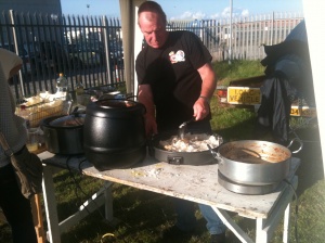 They took out their own cook, seen in the mobile cook-house to prepare food on site. There was even time at the end of the visit for a football match against a local team.