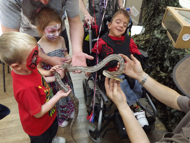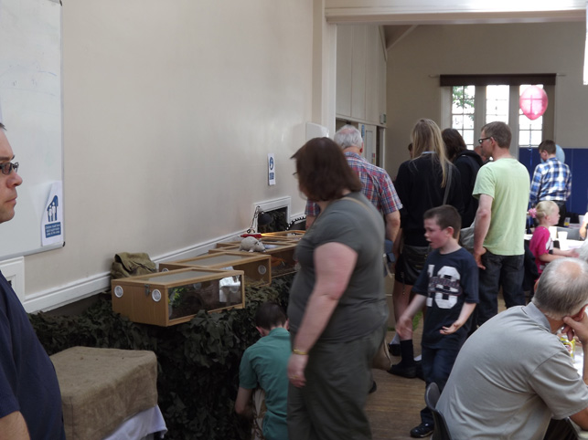 across the room the reptiles zoo attracts its visitors. |