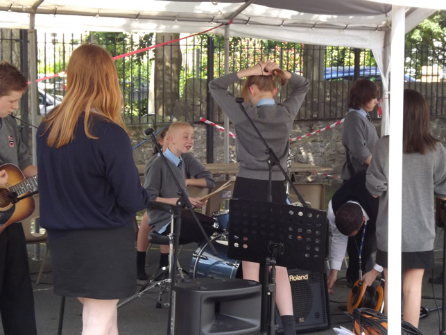 The crowd enjoy the band and some wonder if they are in the right queue |
