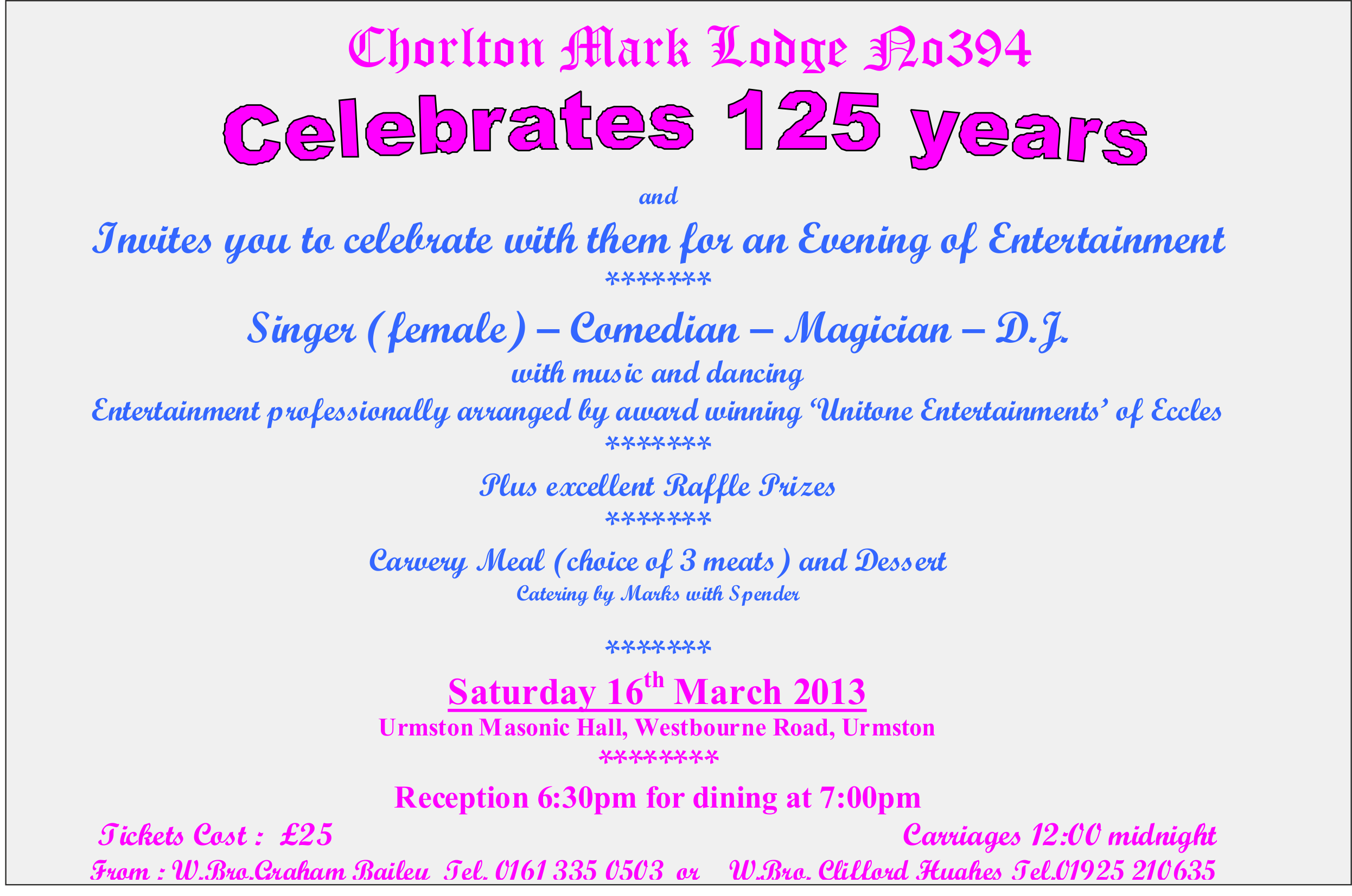 In November 2013 Chorlton Mark will celebrate 125 years of Mark Masonry. (further details will follow) |