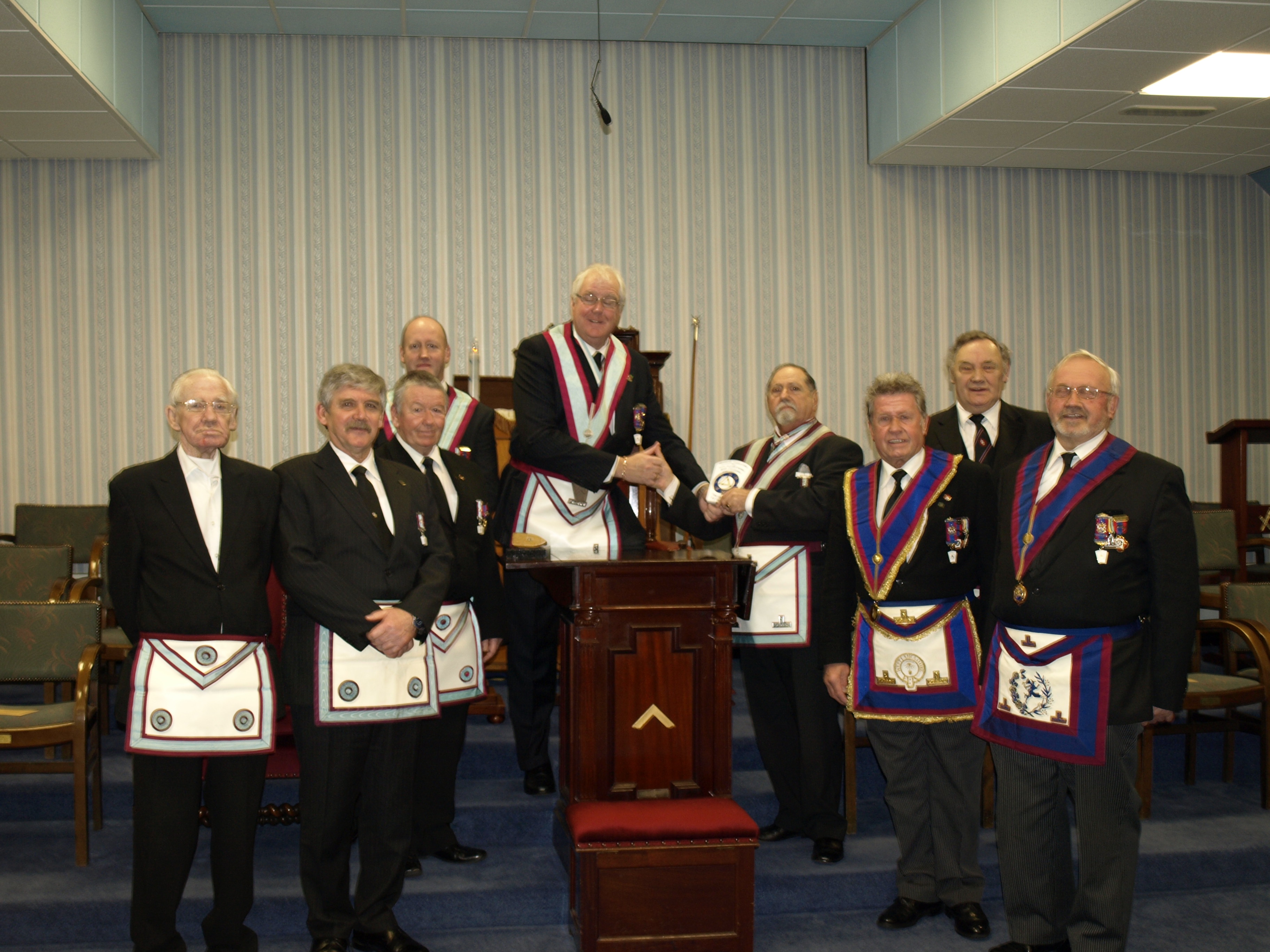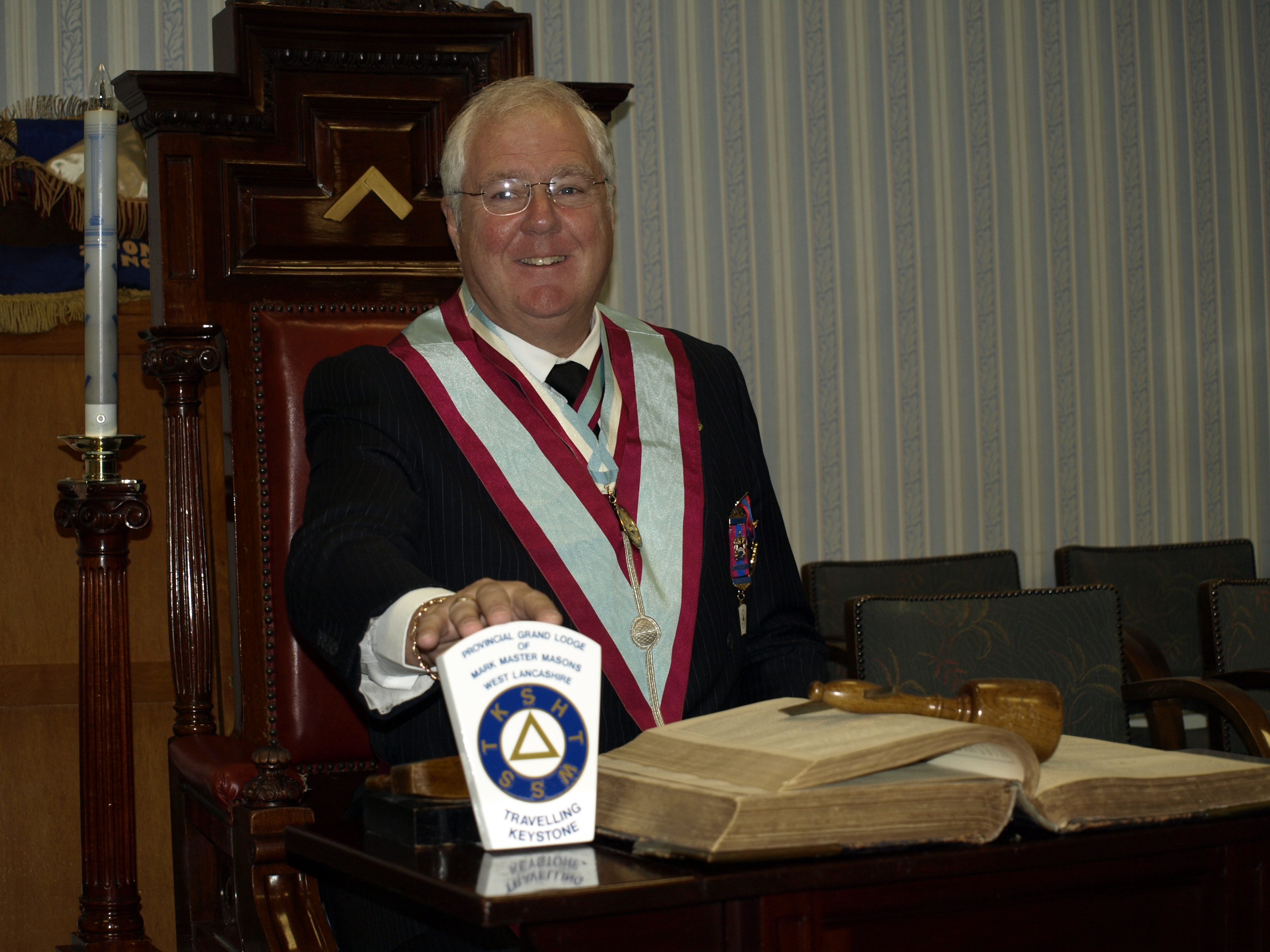 'The Travelling Keystone'At the Provincial Grand Lodge meeting held in Southport in May 2011, W.Bro. Ian Nairn P.G.J.D., Assistant Provincial Grand Master, presented the Province with the "travelling Keystone". To claim the Keystone a Lodge must be represented by a minimum of six Brethren which must include the Master and at least one Warden. If two Lodges visit and qualify, the Lodge with the largest party wins. If they both have the same number in their party then it's the Lodge which has traveled furthest. After the Provincial meeting W.Bro. Jimmy Rogers P.Prov.G.S.O, secretary of Cleveleys Mark Lodge No 1176, approached W.Bro. Nairn and informed him that the Master of Cleveleys Mark Lodge was in attendance, accompanied by his Junior Warden and eight other Brethren and 'claimed' the Keystone. The Keystone made its first appearance at Cleveleys Mark Lodge in September 2011 and was proudly displayed by the Master, Bro John Whitley (see photo - 'It's mine'). One visiting Master on that evening, Bro Leon Tax of Semper Fidelis Mark Lodge No 880, was heard to say when leaving, "I'll be back" and true to his word returned on Tuesday 10th January 2012 accompanied by his Senior Warden, Bro Mike Casey and six other Brethren. Needless to say, Leon claimed his prize (see photo '1176-880'). I wonder how long they will have it for! Jimmy Rogers